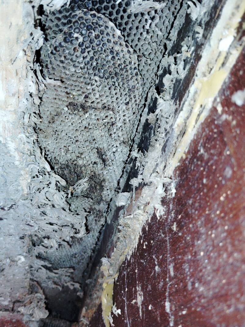 On peut voir ici un nid situé dans un cadre de fenêtre (après traitement)